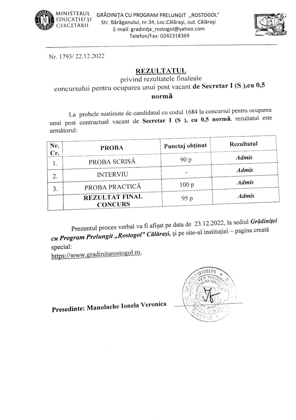 Rezultatul privind rezultatele finale ale concursului pentru ocuparea unui post vacant de Secretar
